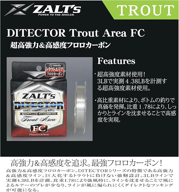 高強力&高感度フロロカーボン。<br>DITECTORシリーズの特徴である高強力&高感度ライン。<br>巨大化するトラウトに負けない強靭設計。<br>3LBラインで実測4.38LBを計測。比重1.78により強風時に、ラインを沈ませることで風によるルアーのブレが少なり、ラインが風に煽られにくくダイレクトなフッキングが可能になる。
