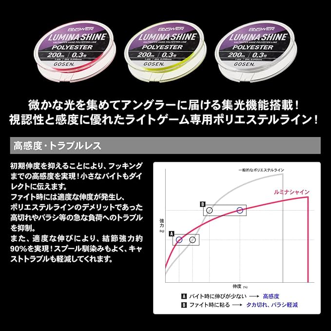 高感度・トラブルレス:初期伸度を抑える事により、フッキングまでの 高感度を実現! ファイト時には適度な伸度が 発生し、急な負荷へのトラブルを抑制。
