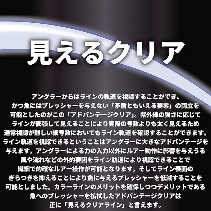 コンセプト: 情報伝達能力に優れた硬質エステルを採用したエリアトラウト専用設計エステルライン! 紫外線に反応し、淡く青白く光り釣果に悪影響を与えること無く、必要最低限の視認性を確保する「アドバンテージ クリアカラー」採用。