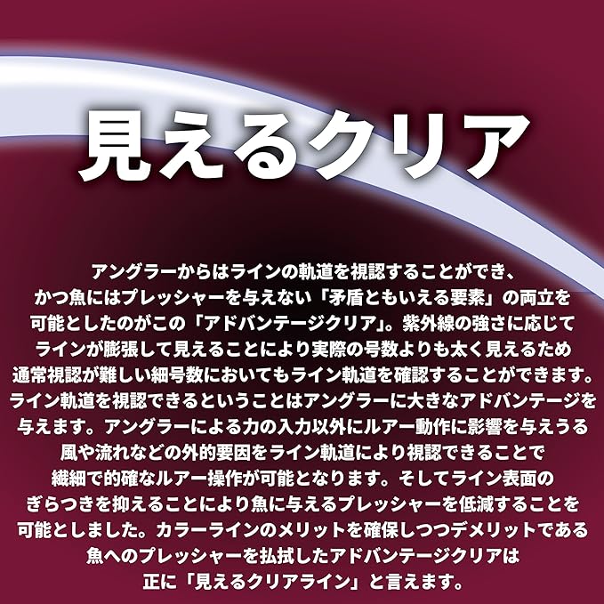 コンセプト: エリアトラウト専用設計のトラブルレス性に優れた軟質エステルライン! 紫外線に反応し、淡く青白く光り釣果に悪影響を与えること無く、必要最低限の視認性を確保する「アドバンテージ クリアカラー」採用。