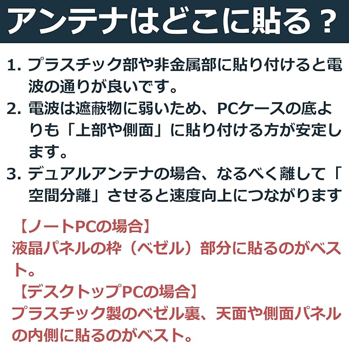 【用途】ノートPCの無線LANカード交換、自作PCやMini-PCのWiFiアップグレード、WiFi 6E/7環境の構築に便利な内蔵アンテナ。安定した高速通信を実現します。