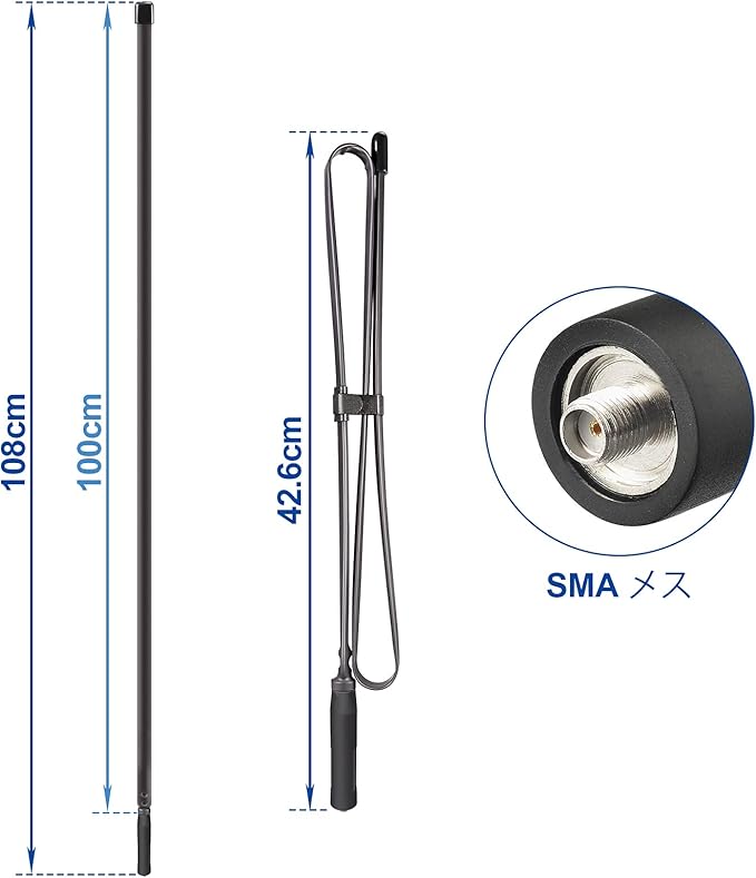 折りたたみ式CSハムラジオアンテナ、周波数範囲:136-520MHz、ゲイン: 3.5dBi、方向性:無指向性、インピーダンス:50Ω、最大入力電力:8W、アンテナ長:108cm