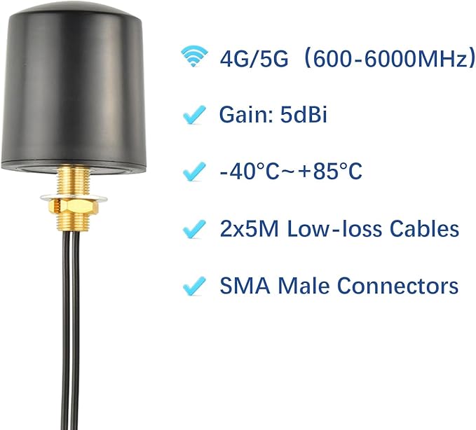 幅広い周波数対応:600-6000MHz | 利得:5dBi | タイプ:無指向性・MIMOアンテナ| インピーダンス:50Ω |ケーブル:5M・低損失・BMR100同軸ケーブル|コネクタ:デュアルSMAオス