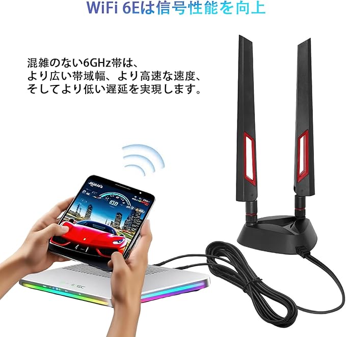 トライバンド WiFi 6E アンテナ: 2400-2500MHz/5150-5850MHz/5900-7125MHz。6dBi の高ゲインでより強い信号とより速い速度を実現します。