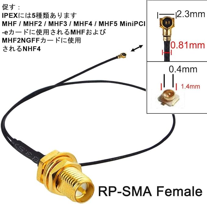 ✿パッケージ内容:RPSMAオス・WIFIアンテナ(2.4/5.8Ghz)*2個+RPSMAメス(ピン有り)ーMHF4コネクタ・0.81mm・ケーブル*2本