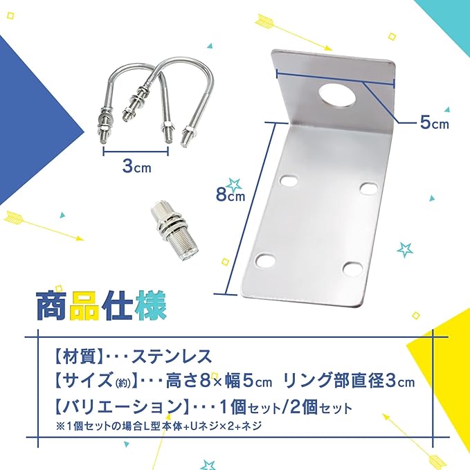 アンテナ基台 ステーは、ポールや柱などにUボルトで固定し、アンテナケーブルを付属のリングに通して使用可能。基台 パイプとしても活用でき、耐久性に優れた設計で屋外での長期間使用にも適しています。様々なアンテナの取り付けに対応する便利なアイテムです。