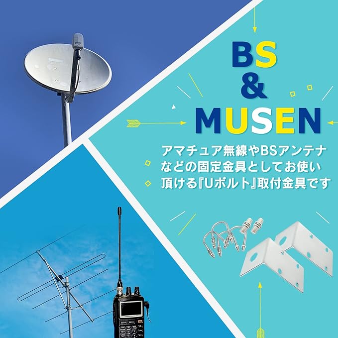 取り付けサポートは行っておりません。海外輸入品のため説明書の付属もなく、設置に関しては専門業者にご依頼ください。Uボルト取付金具でしっかり固定でき、アマチュア無線機アンテナやBSアンテナなど、様々な用途でご利用いただけます。