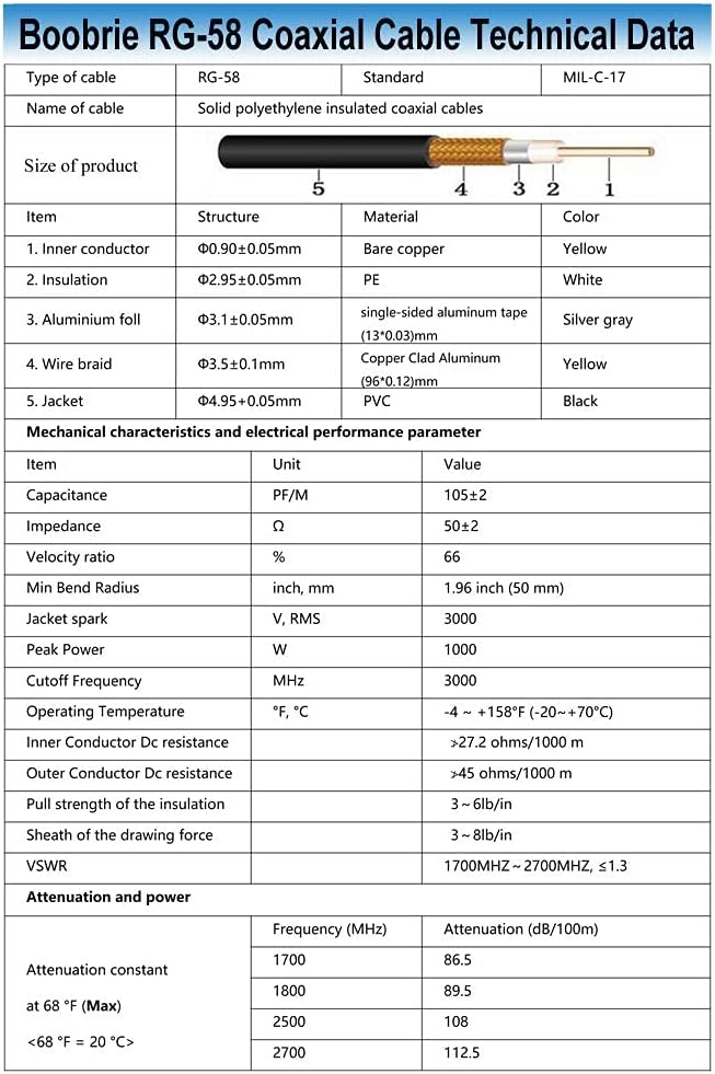 ✿BOOBRIE RG58同軸ケーブル。96*0.12MM編組銅線を使って、良い導電性と伝送効果を持って、性能と実用性から、コストパフォーマンスが高いです。