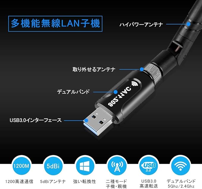 無線LAN 子機 1300Mbps wifi アダプタ 2.4G/5G USB3.0式 5dBi高速通信 360度回転 802.11ac/n/a/g/b Windows 7/8/10/Vista/XP/Mac OS X 対応 【技適認証番号:R 204-920417】