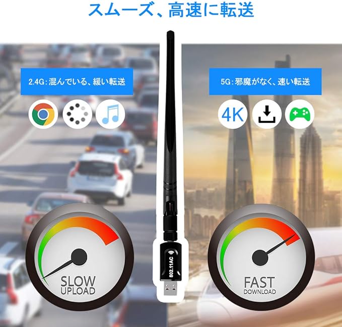 【11ac技術・ デュアルバンド】デュアルバンドで高速通信、接続デバイスが増えると通信速度が低下します。wifi usbはルーターとの距離が近く、またビデオやオンラインゲームをする場合、5Gバンドを勧めです。無線 LAN 子機はルーターとの距離が遠く、またウェブサイトをサーフィンしたい場合、2.4Gを勧めです。ご注意:ネットに接続する前に、ドライバーをインストロールが必要となります。