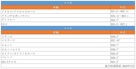 ● 【対応車種】: - ホンダ:フリード、ヴェゼル、オデッセイ、フィット、ステップワゴン、Nbox、None、Nwgn、グレイス、ジェイド、シャトル、ライフ、CR-V、CR-Z - スズキ:イグニス、エスクード、ジムニー、ジムニーシエラ、スイフトスイフトスポーツ、バレーノ、SX4 Sクロス - マツダ:アクセラ、アテンザセダン、プレマシー、CX-5