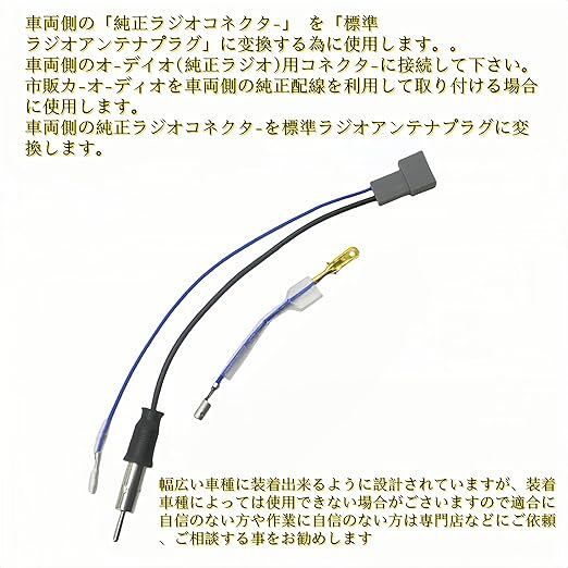 ● 【純正コネクター変換】:このキットは、車両側の純正ラジオコネクターを標準ラジオアンテナプラグに変換するため使用します。