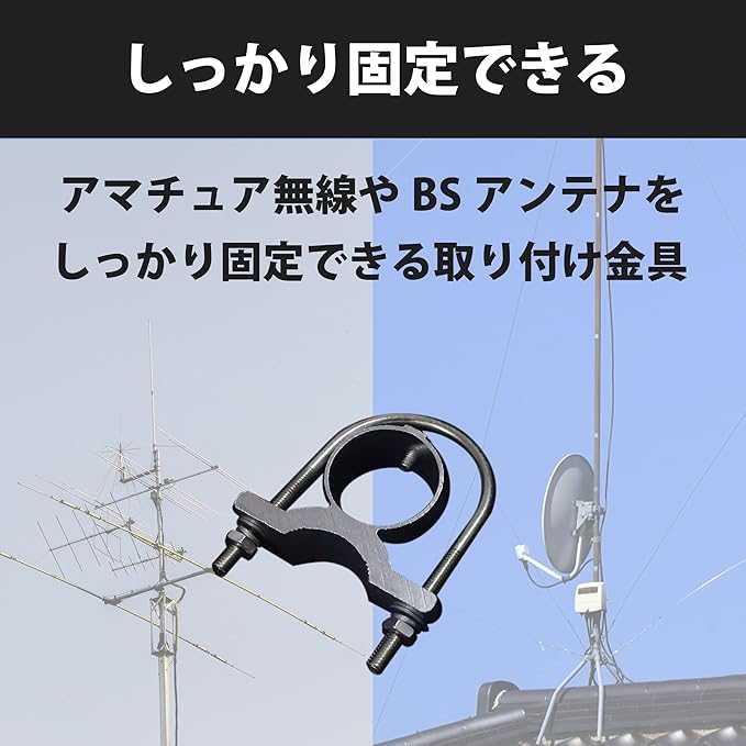 しっかり固定できる取り付け金具:ポールや柱などにアマチュア無線のアンテナやBSアンテナを固定するための取り付け金具です。Uボルトタイプなので、しっかりと固定することができます。