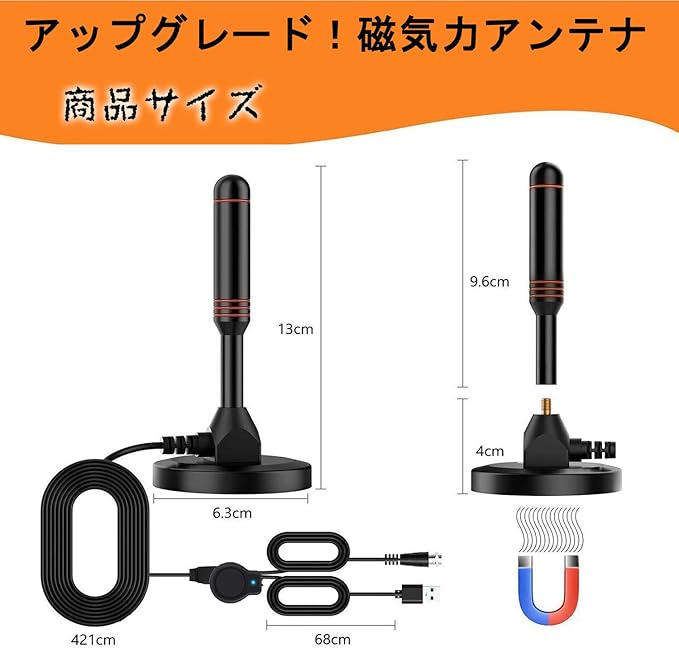 【コンパクトなロッド設計】テレビアンテナ、この製品は、磁気底面を備えたコンパクトなロッドアンテナです。窓や壁に取り付けることができるだけでなく、デスクトップに置くこともできます。すべての方向から信号を取得するように設計されています。ペーパーアンテナとは異なり、簡単に移動して表示チャンネルの受信感度を確認できます。