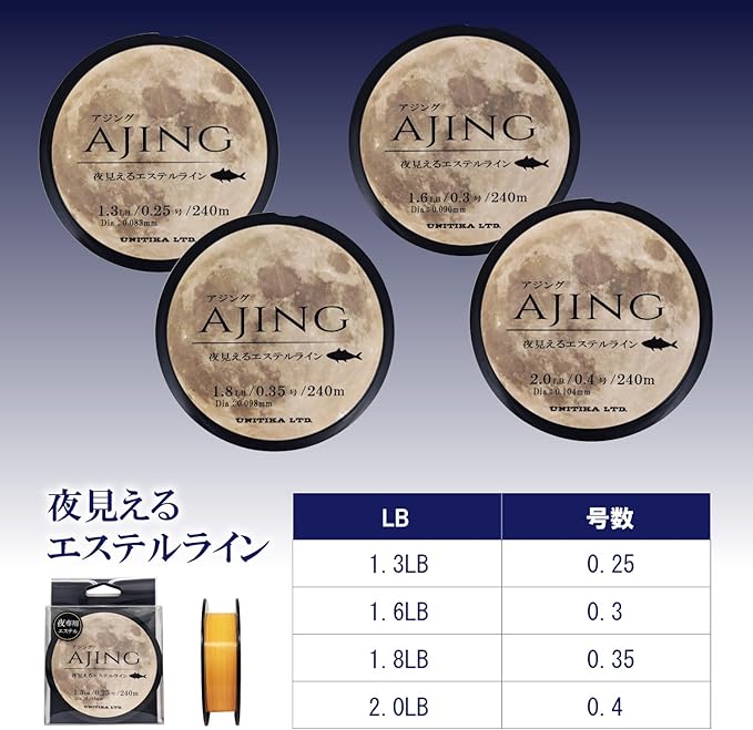 モデル:【夜見えるエステルライン】……夜釣りの中でも、くっきりと見やすい「パステルオレンジカラー」採用。アジングに最適なエステルライン!!