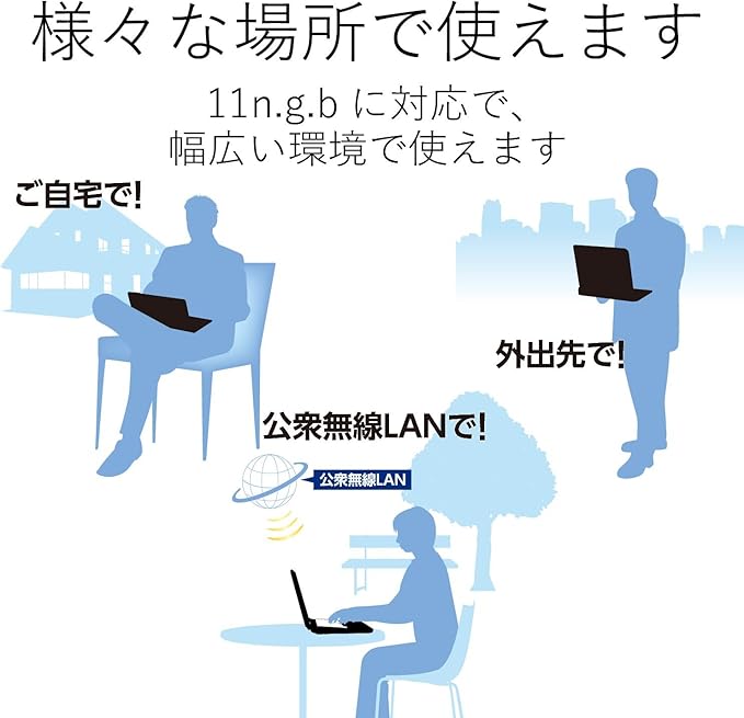 業界標準の2.4GHz通信に対応し、宅内のルータはもちろんの事、Wi-Fiスポットやポケットルータなど幅広い環境で使えます。