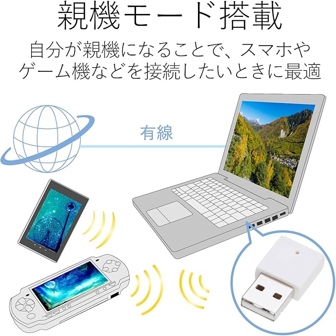 IEEE802.11b/g/nに対応し、最大300Mbpsの無線通信が可能です。業界標準の2.4GHz通信に対応し、宅内のルータはもちろんの事、Wi-Fiスポットやポケットルータなど幅広い環境で使えます。装着したまま持ち運んでも邪魔になりません。