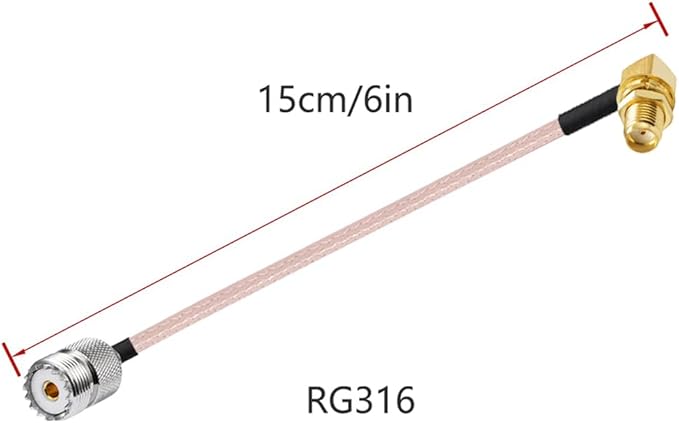 コネクタ1:SMAメス 直角|コネクタ2:UHF メス SO239|ケーブル種別:RG316|ケーブル長さ:6インチ/15cm|インピーダンス:50 オーム