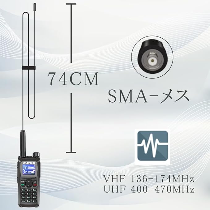 [情報] 長さ:29.1 INCH/74CM 周波数範囲:VHF 136-174MHz; UHF 400-470MHz インピーダンス:50 ohm コネクタ:SMA-メス ホイップアンテナ