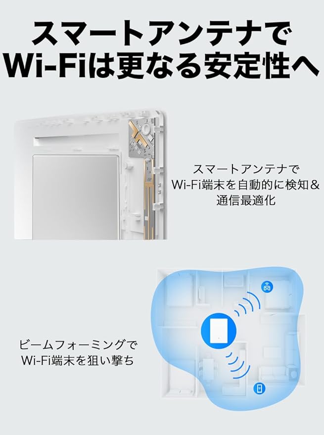 [スマートアンテナ] 内蔵アンテナにはハイレベルなスマートアンテナを搭載。Wi-Fi子機側を高度なアルゴリズムで探し当て、効率的かつ安定的な通信を実現