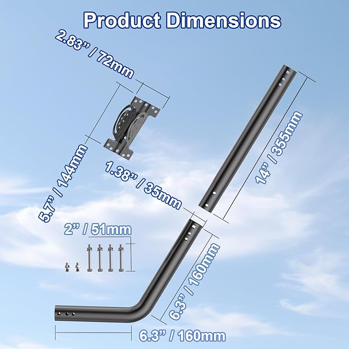 柔軟なデザイン: このブラケットは延長ポールの使用をサポートしており、複数のポールを追加して高さを増すことができます。本体は13インチの高さで、各延長ポールは12インチです。メインユニットのみを使用するか、複数の延長ポールを組み合わせて特定の高さ要求に合わせて調整できます。