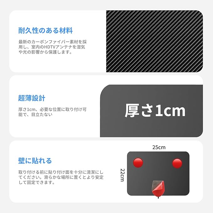 軽量化設計:超薄ボディ、簡単に置き換え可能。付属の 5m 長ケーブルで、電波を受信しやすい位置に簡単に設置でき、360 度全方位受信に対応して強電界・弱電界地域でも安定した受信を保証。USB 電源ケーブルを挿してテレビに接続するだけで、設置→接続→チャンネル検索の 3 ステップですぐに視聴開始。裏面の両面テープで壁や窓に固定可能で、ネジによる壁取り付けも対応。