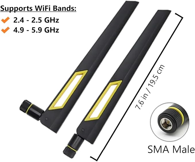 Boost your Wi-Fi! Upgrade your router and/or wireless adapter with high-gain antennas! Specifications:Frequency Range: 2.4 / 5 GHz Wi-Fi bands (2.4 - 2.5 GHz /4.9 - 5.9 GHz)VSWR: <=1.5Gain: 10 dBi (MAX)Polarization: VerticalMaximum Power: 50WConnector Type: SMA MaleColor: Black/GoldLength: 4.3 in / 10.8 cm