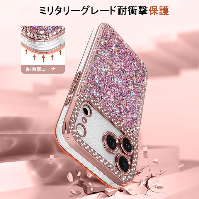 【キラキラと輝くデザイン】: この美しいスマホケースは、ボーダーとカメラレンズリム部分に施されたダイヤモンドで豪華な印象をかもし出します。背面には微細なグリッターを樹脂層で封入する独自加工を採用しています。粉落ちや変色の心配がなく、長期間にわたり強い輝きを維持します。光の角度によって変化する繊細なきらめきが、あなたの携帯電話を高級アクセサリーへと変えます。