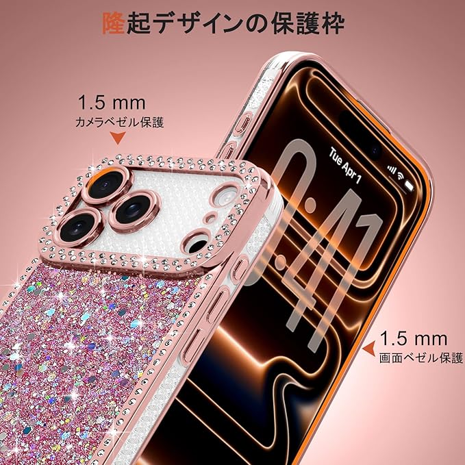 【画面とカメラの保護】:このきらきらした あいふおん 17 Pro Max 用スマホケースは、洗練された外観だけでなく、優れた保護性能も備えています。フレームがわずかに盛り上がっているため、画面とカメラレンズを机などに置いた時の傷や汚れから守ります。