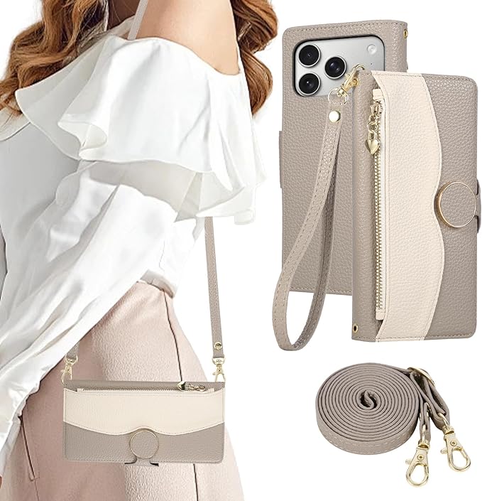 用の iPhone 17 Pro Max ケース 手帳型 ショルダー スマホケース いphone17promax ケース おしゃれ 2色パッチワーク 携帯カバー iphone17promax ケースカバー 小銭入れ カード収納 ジップ付き 財布型 アイフォン17 プロマックス 手帳型ケース 肩掛け 斜め掛け ストラップ付き スタンド機能 マグネット式 可愛い 女性 贈り物-グレー