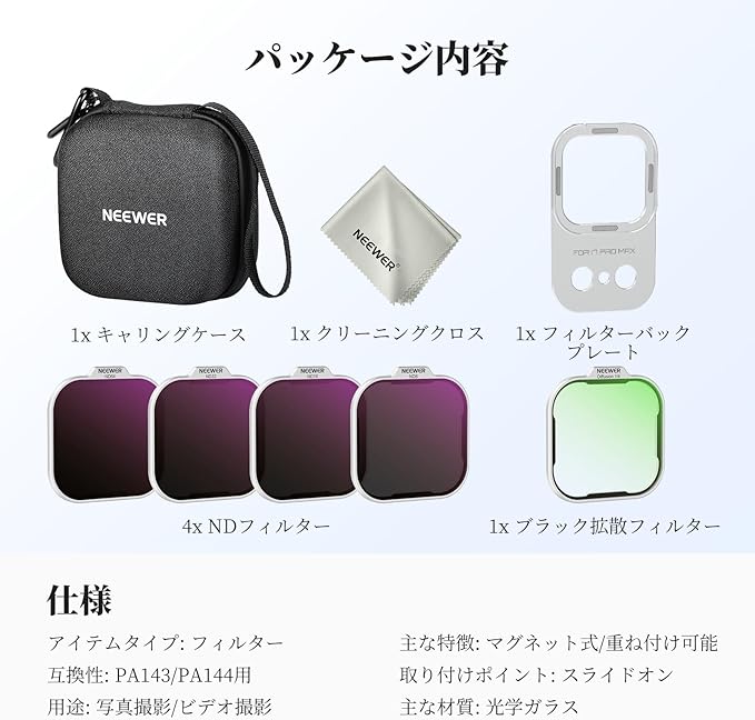 【PA134スマホケース専用】フィルターアクセサリーセットは、NEEWER PA134スマホケース(iPhone 17 Pro Max対応)専用です。コンテンツクリエイターやインフルエンサーにとって必要なアイテムで、モバイル撮影、スマホカメラでのVlog、動画撮影などに最適です。