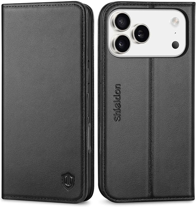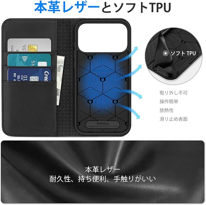 SHIELDON iPhone 17ProMax 対応 手帳型ケース 本革レザー 6.9インチ 5G TPU素材 カード収納 [RFIDブロッキング] 横置きスタンド機能 マグネット内蔵 ストラップ穴付き 衝撃吸収 あいふぉん 17プロマックス 対応 スマホケース 2025年発売 ブラック