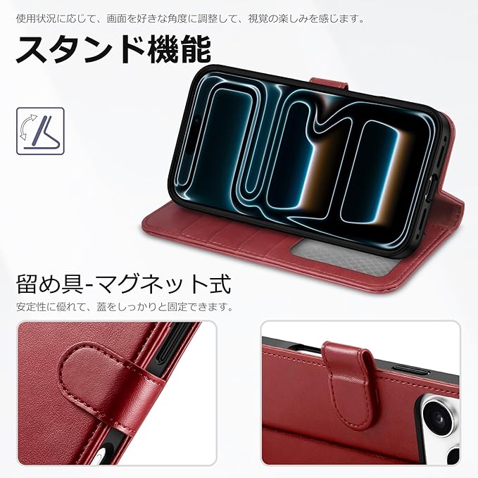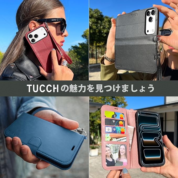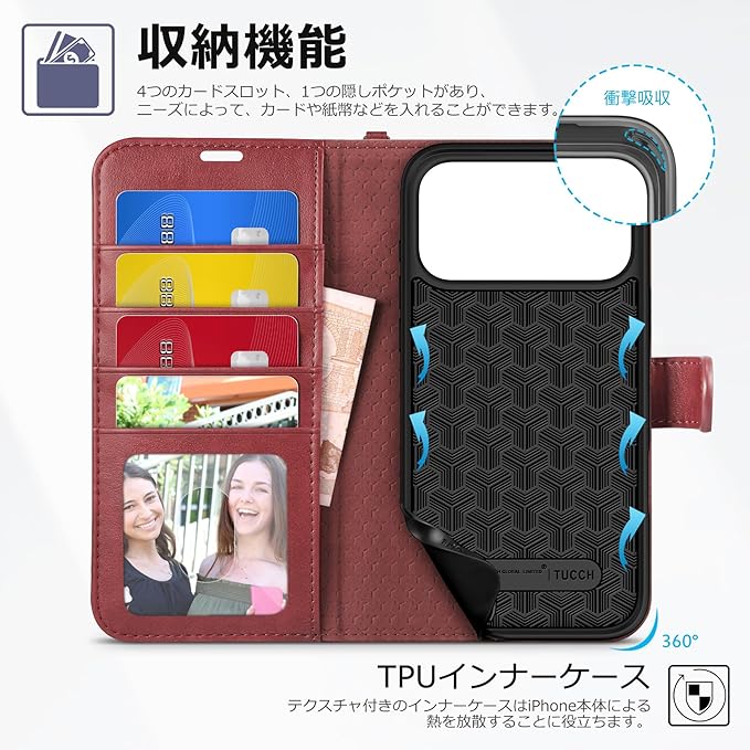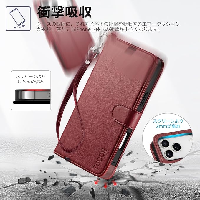 TUCCH iphone 17Pro Max 対応 ケース 手帳型 ストラップ付き 6.9インチ 4つカード収納 RFIDブロッキング 横置きスタンド機能 TPU素材 PU合皮 全面保護 衝撃吸収 アイホン17プロマックス 対応カバー 2025年発売 ダークレッド