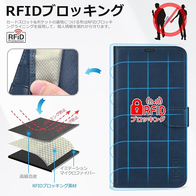 【スキミング防止機能】カードポケットの裏地にはRFIDブロッキング素材を採用し、スキミング防止機能を備えています。これにより、ICカードの信号を遮断することで、個人情報を保護します。ご注意:改札機通過時はカードが反応しない場合がありますので、その際はカードをポケットから取り出してご利用ください。