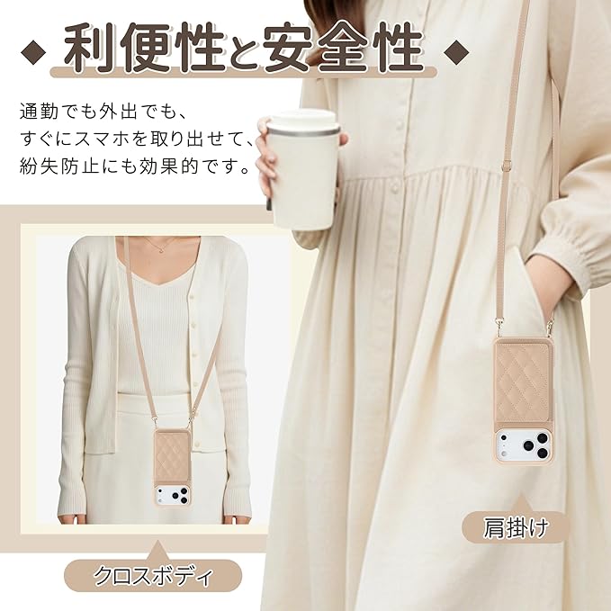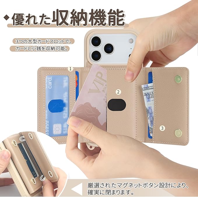 【対応機種 & 精密設計】このウォレット型スマホケースはiPhone 17 Pro Maxに対応しています。カメラ、スピーカー、充電ポート、電源ボタン、音量ボタンなどのすべての開口部は、ミリ単位の精密金型で成形されており、本体の曲線に完璧にフィットします。装着後も撮影、充電、ボタン操作に影響がなく、日常使いもスムーズです。全面的な保護を提供しながらも、スマホに余計な負担をかけることはありません。ご注文前に、お使いの機種とカラーをご確認ください。セット内容:スマホケース 1、調節可能なショルダーストラップ 1。