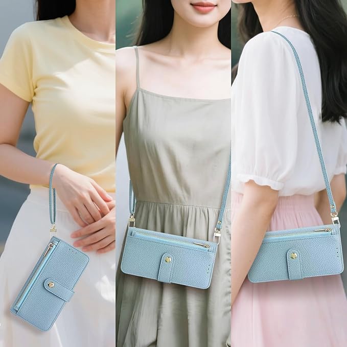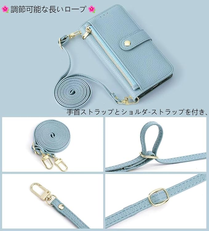 Vokpok対応 iPhone 17 Pro Max ケース 手帳型 強力マルチカード収納 スタンド機能 アイフォン 17プロマックス 財布型ケース 肩掛け 斜めがけ 手首かけ、掛けストラップ付き おしゃれ 実用性 ジッパー小銭入れ アPhone 17 Pro Max スマホケース PUレザー ある滑らかな手触り アイフォン 17 プロマックス ケース, ライトブルー