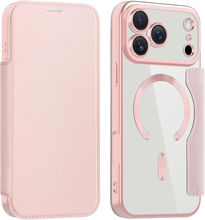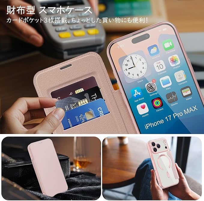 【REHOOF】iPhone 17 pro max ケース 手帳型 magsafe対応 背面 透明 クリア 財布型 アイフォン 17 プロマックス ケース マグセーフ 手帳 ワイヤレス充電対応 カード入れ PU革 レザー スマホケース 軽量 薄型 防塵 耐衝撃 全面保護 スマホカバー(ピンク)