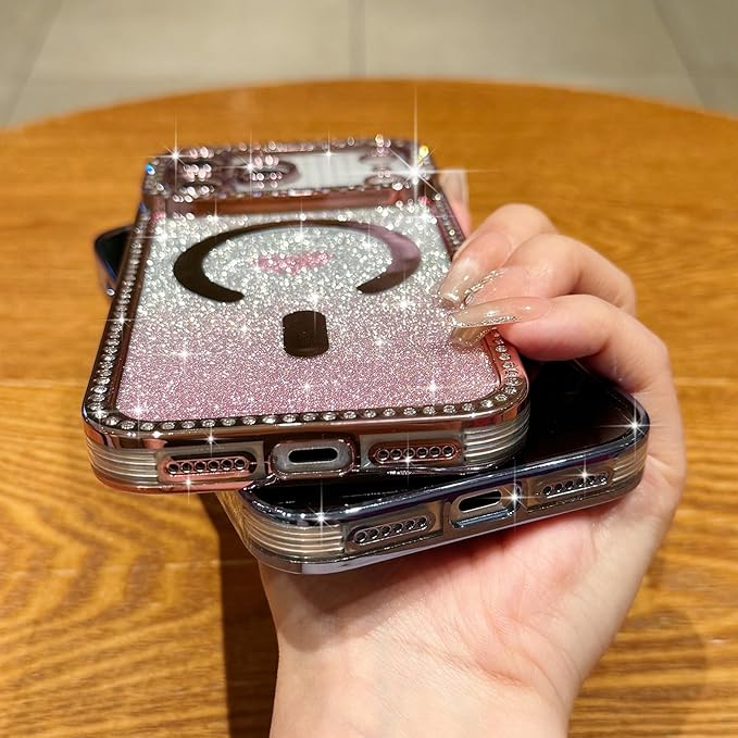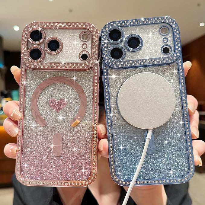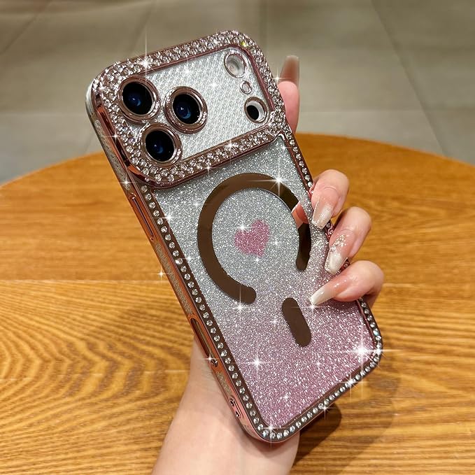 Lafunfa iPhone 17 Pro Max 用 ケース MagSafe対応 かわいい 女の子 キラキラ 透明 マグネットカバー [グリッターカード付き] ハート柄 グラデーション 光沢 ダイヤモンド 軽量衝撃吸収 [フルカメラ保護] ワイヤレス充電 アイフォン 17 Pro Max 用 スマホケース ピンク