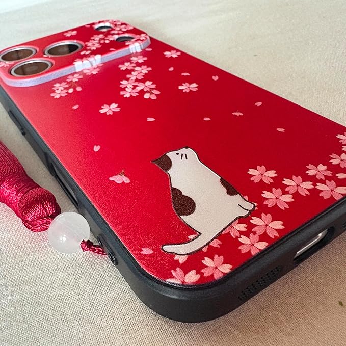 KOLO【猫と桜】iPhone対応 17 Pro Max スマホケース ねこ ネコ 和柄 かわいい イラスト カバー(赤) iPhone17 Pro Max