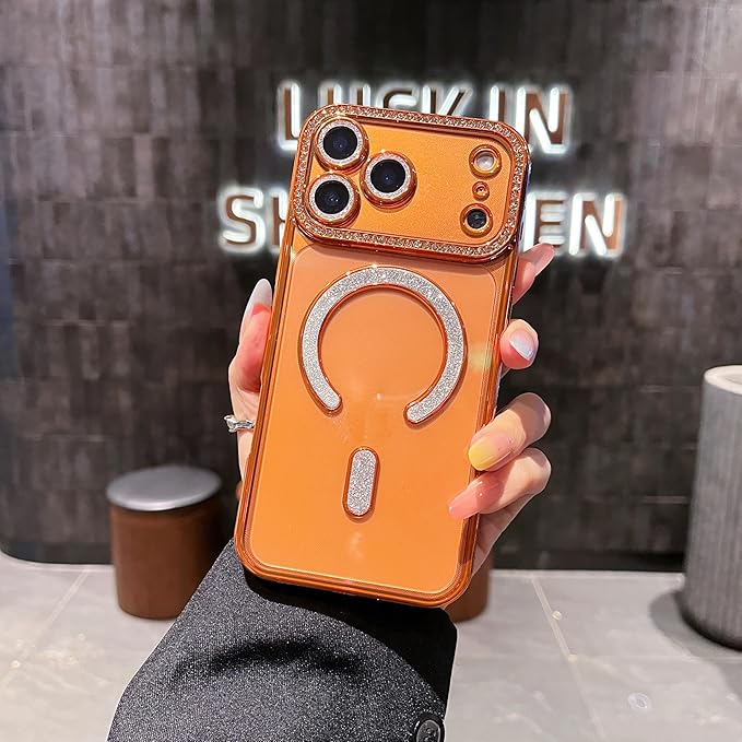 兼用 スマホケース iPhone 17 Pro Max ケース キラキラ クリア Magsafe対応 ラインストーン カメラレンズ保護 ラメ おしゃれ 可愛い ソフト シンプル マグネット搭載 ワイヤレス充電対応 耐衝撃 黄ばみなし 軽量 薄型 ストラップホール付き (オレンジ)