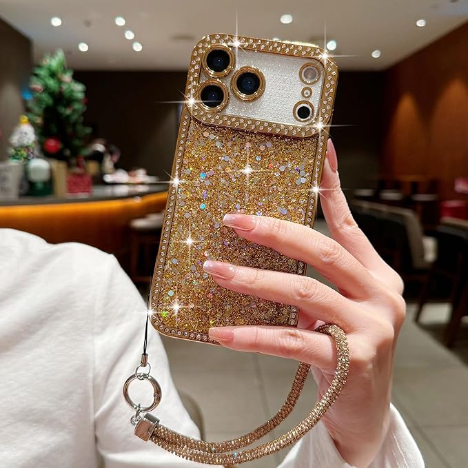 Lafunda 用の iPhone 17 Pro Maxケース キラキラ ラメ スマホケース 女の子 韓国 おしゃれ グリッター リストストラップ サラウンドレンズ保護 軽量 薄型 耐衝撃 ワイヤレス充電対応 用の アイフォン17 Pro Max カバー (ゴールド)