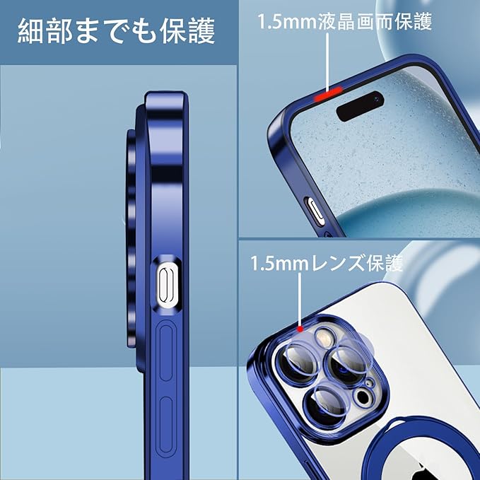 MuZiF iPhone 17 Pro Max 用 ケース MagSafe対応 リング付き クリア メッキ加工 カバー 車載ホルダー対応 多機能 レンズ保護 薄型軽量 耐衝撃構造 透明柔らかいTPU アイフォン17 プロマックス 用 磁気カバー クリアケース(ダークブルー)