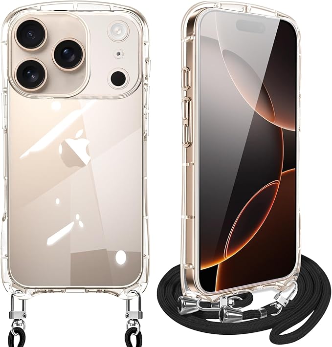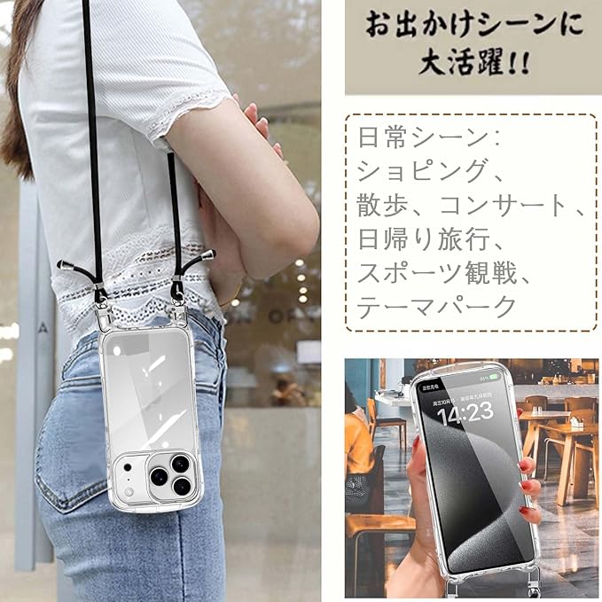 iPhone 17 Pro Max 用 ケース ショルダー クリア アイフォン17 Pro Max スマホケース カバー 全透明 TPU 耐衝撃 ストラップ付き 肩掛け 首掛け 紐付き 斜めがけ 取り外し可能 長さ調整可能(クリア)
