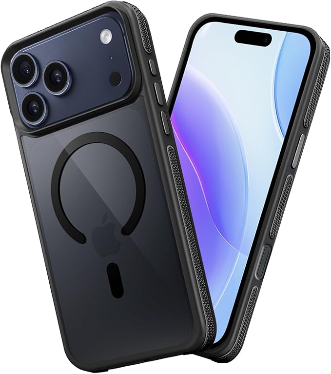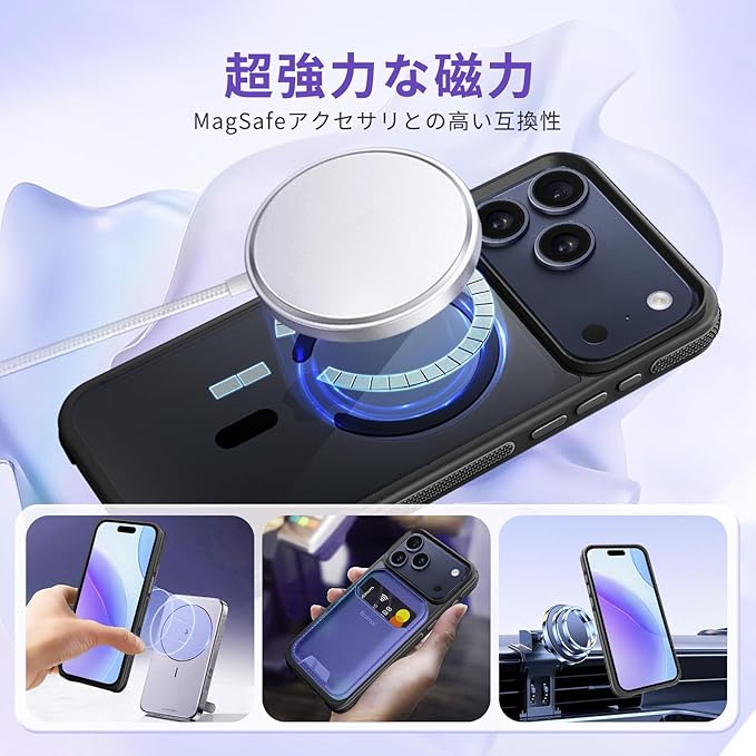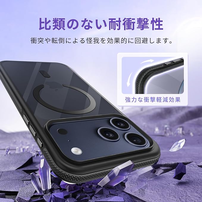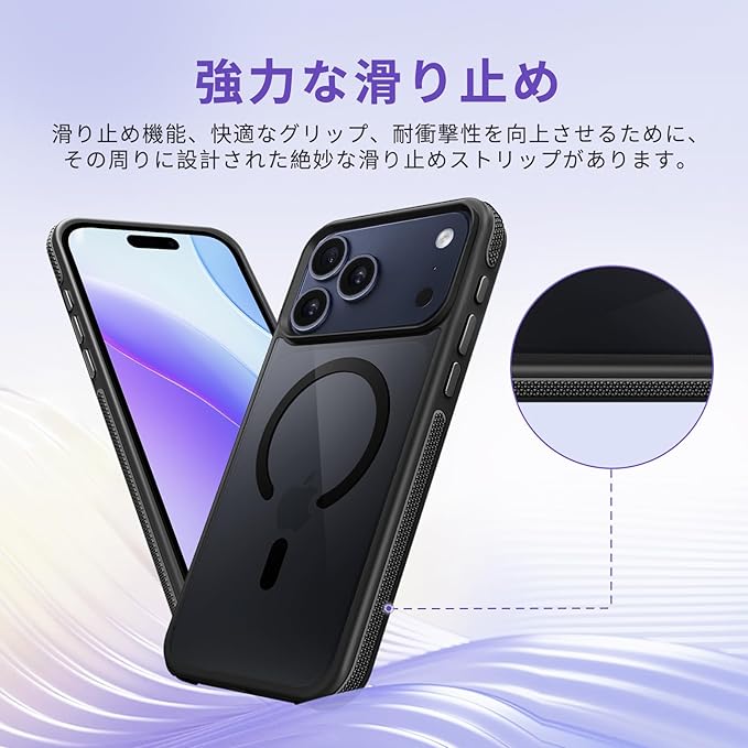 対応 iPhone 17 Pro Max ケース MagSafe対応 耐衝撃 半透明 【滑り止めと衝突防止のツーインワンエッジ】 対応 iPhone 17 Pro Max スマホケース 衝撃吸収 滑り止め 傷防止の いpほね17ProMax カバー ワイヤレス充電対応 米軍MIL規格 衝突防止ストリップフレーム レンズ保護 薄くて 人気 (ブラック)