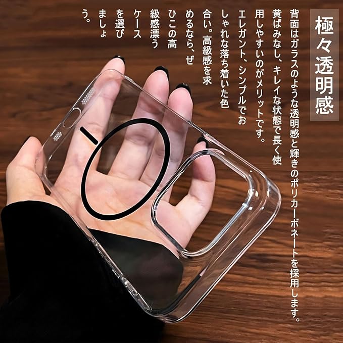 【極々透明感】背面はガラスのような透明感と輝きのポリカーボネートを採用します。黄ばみなし、キレイな状態で長く使用しやすいのがメリットです。エレガント、シンプルでおしゃれな落ち着いた色合い。高級感を求めるなら、ぜひこの高級感漂うケースを選びましょう。