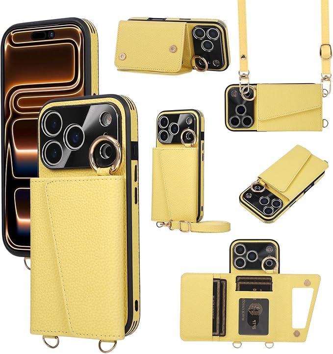 Pelanty 縄掛けケース For iPhone 17 Pro Max 手帳型ケース for iPhone17 Pro Max ケースリング 携帯カバー 肩掛け斜めがけショルダー ストラップ付き PUレザー+TPU アイフォン17プロ Max 背面カバー お札入れ小銭入れ 財布型ICカード収納 スタンド機能 ボタン磁気 耐衝撃 落下防止 イエロー