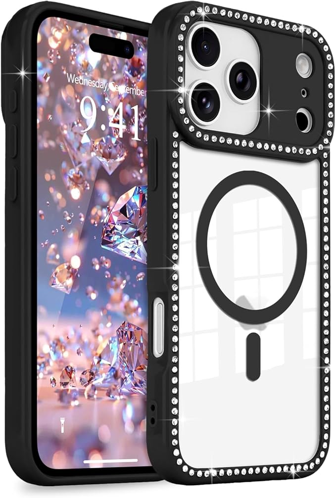 LCHULLE 用の iPhone 17 Pro Max ケース MagSafe 対応 透明 キラキラ ラインストーン かわいいクリア マグネットカバー マグセーフ 対応 女性 韓国 黄ばみ防止 軽量 薄型 耐衝撃 カメラ保護 用の アイフォン 17 Pro Max スマホケース (ブラック)