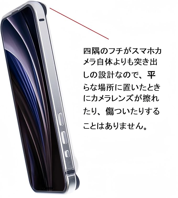カメラレンズ保護、擦り傷防止:バンパー四隅のフチがスマホカメラ自体よりも突き出しの設計なので、平らな場所に置いたときにスクリーンやカメラレンズが擦れたり、傷ついたりすることはありません。