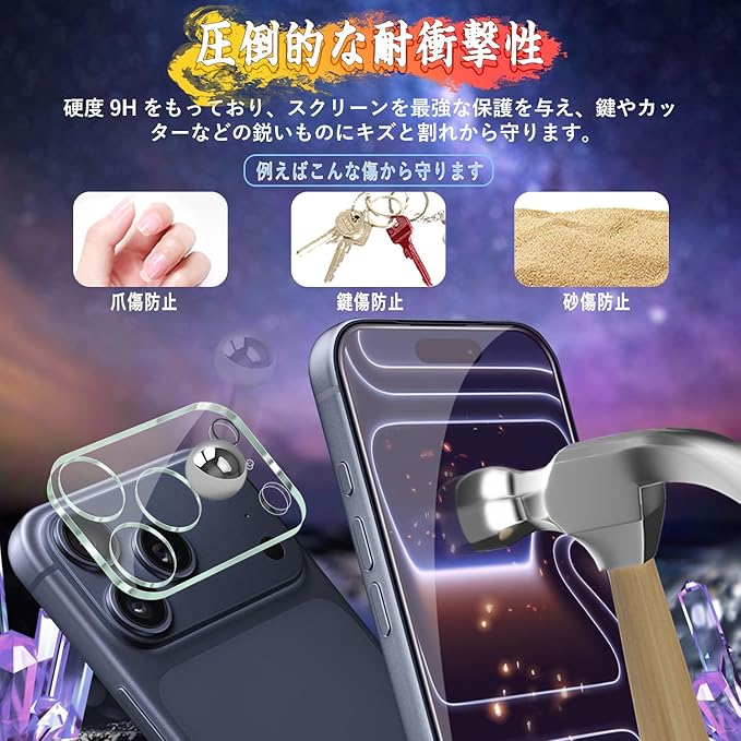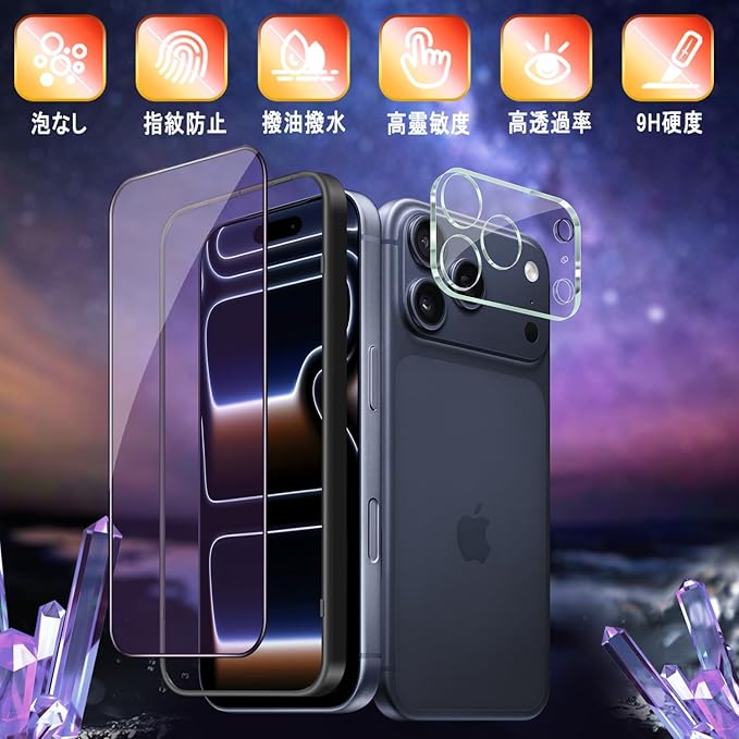 対応 iPhone 17 Pro Max ガラスフィルム(1枚)+ iPhone 17 Pro Max カメラフィルム(1枚)【ブルーライトカット】 目の疲れ軽減 硬度9H 全面保護 自動吸着 気泡防止 指紋防止 アイフォン17 Pro Max 保護フィルム