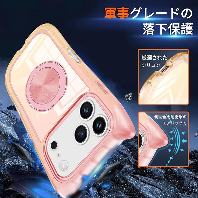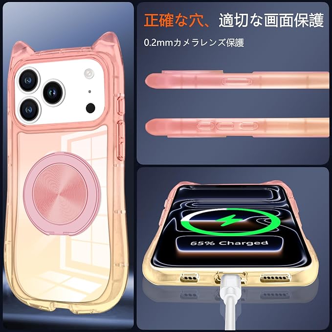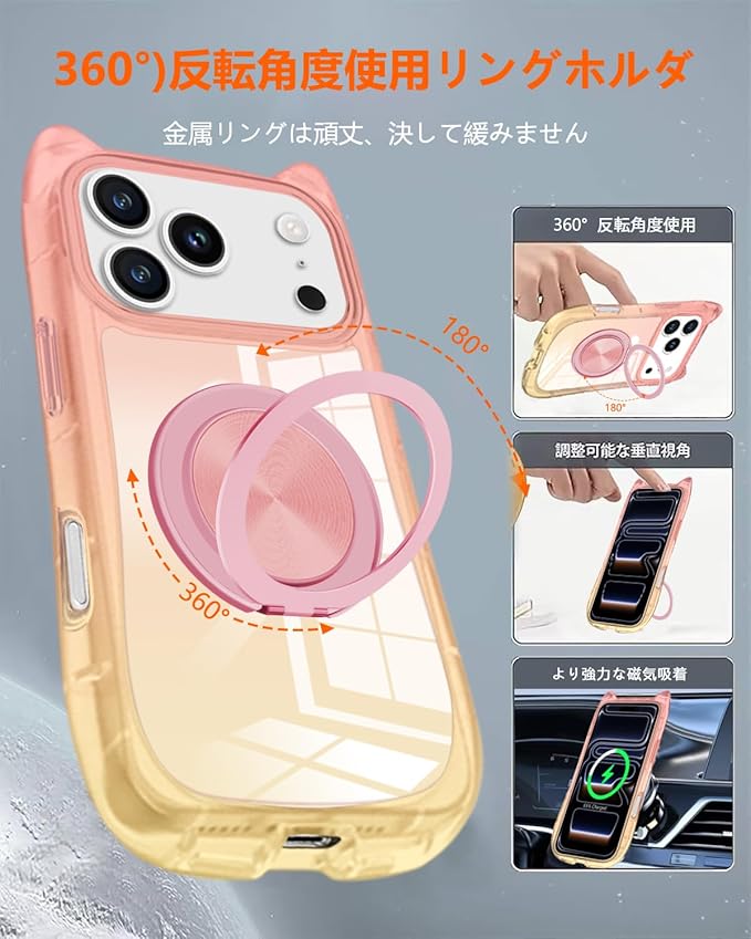 iPhone 17 Pro Max 用 ケース グラデーション 多機能360度回転スタンド 縦横両用 マリング付き [MagSafe 対応] アイフォン17promax スマホケース 可愛い 猫耳 ネコミミ 耐衝撃 滑り止め 黄ばみなし 薄型 軽量 全面保護